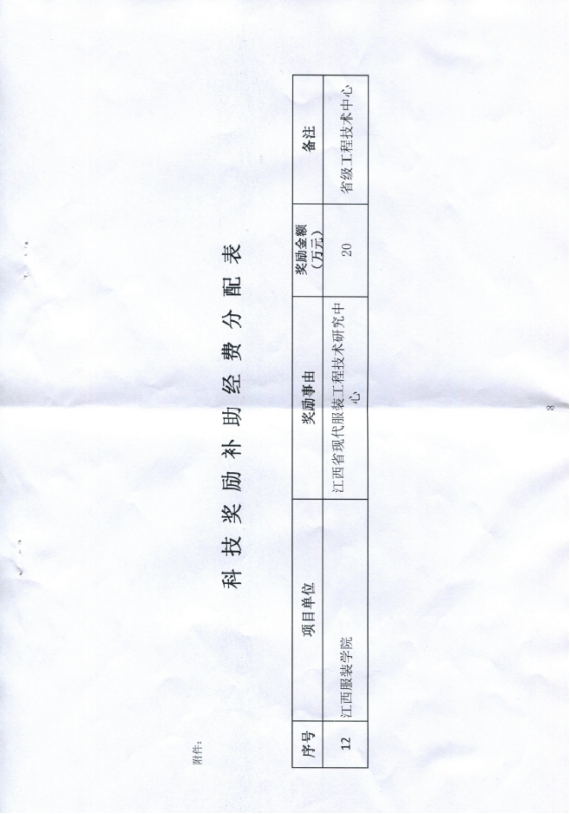 (江西省现代服装工程技术研究中心 讯)江西省现代服装工程技术研究中心(江西服装学院)于2016年12月19日,经江西省科技厅正式批准组建(赣科发财字〔2016〕192号)。自2014年成立以来,本中心研究设备经费投入已达千万余元。本中心于2017年11月,向南昌县教科体局、南昌县财政局,提出申请给予一定的科技奖励补助经费。最终,经有关部门审定,给予江西省现代服装工程技术研究中心(江西服装学院)县级科技奖励补助经费20万元(南教科体【2017】52号),为工程技术中心科技项目的开展和科研经费的正常有序运行提供了重要的保障。